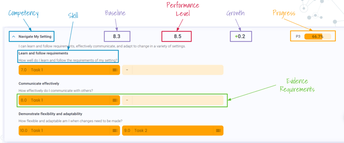 Each skill has a set number of evidence requirements that learners must meet to progress. These requirements are pre-set but can be personalized to support individual learner needs. Evidence could include presentations, essays, lab reports, problem sets, or project deliverables, as some examples.