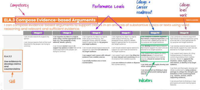 Each competency includes a continua that outlines its skills and stages or performance levels. These progressions indicate learner growth within and across stages. Performance levels do not correspond to grade levels, and learners can achieve by demonstrating growth, even if they have not yet achieved a specific performance level.