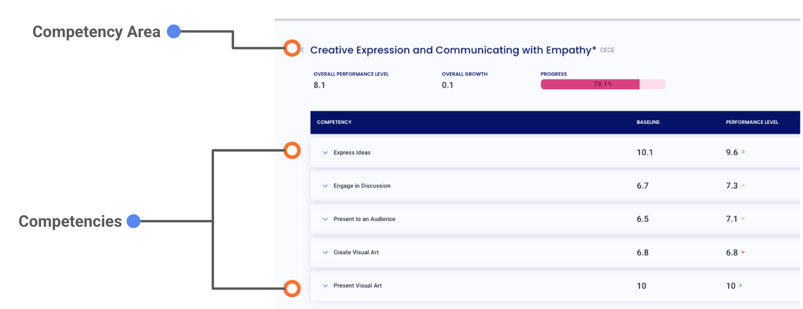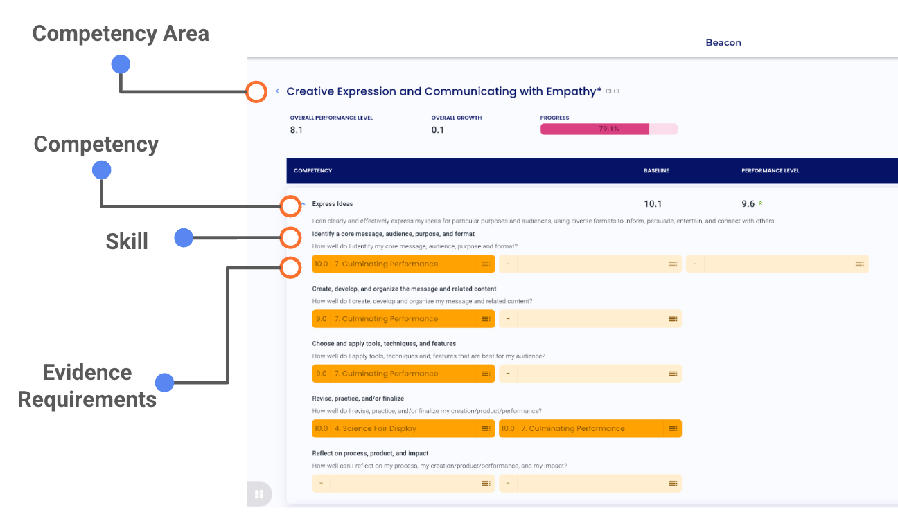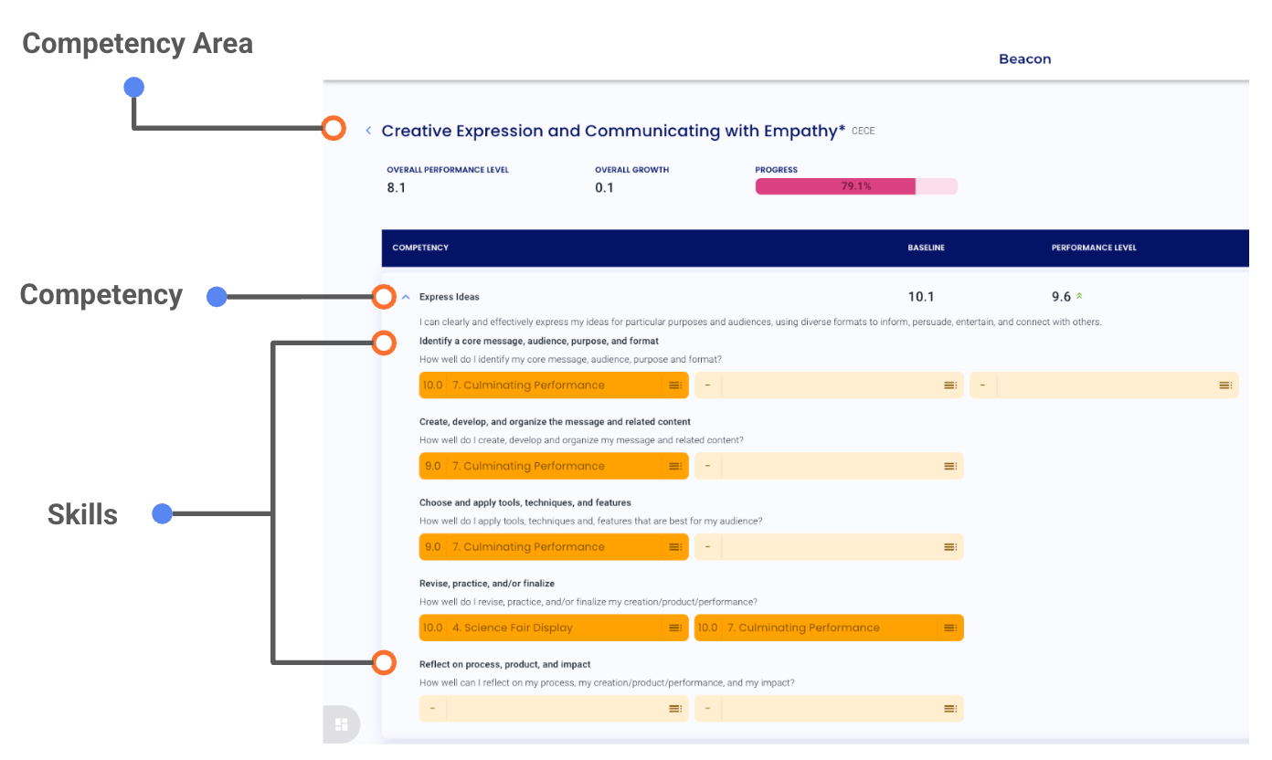 A competency explains what learners should know and be able to do within a competency area. For example, Express Ideas is a competency within Creative Expression and Communicating with Empathy. You can view a learner’s competencies by selecting a competency area on the Progress page.