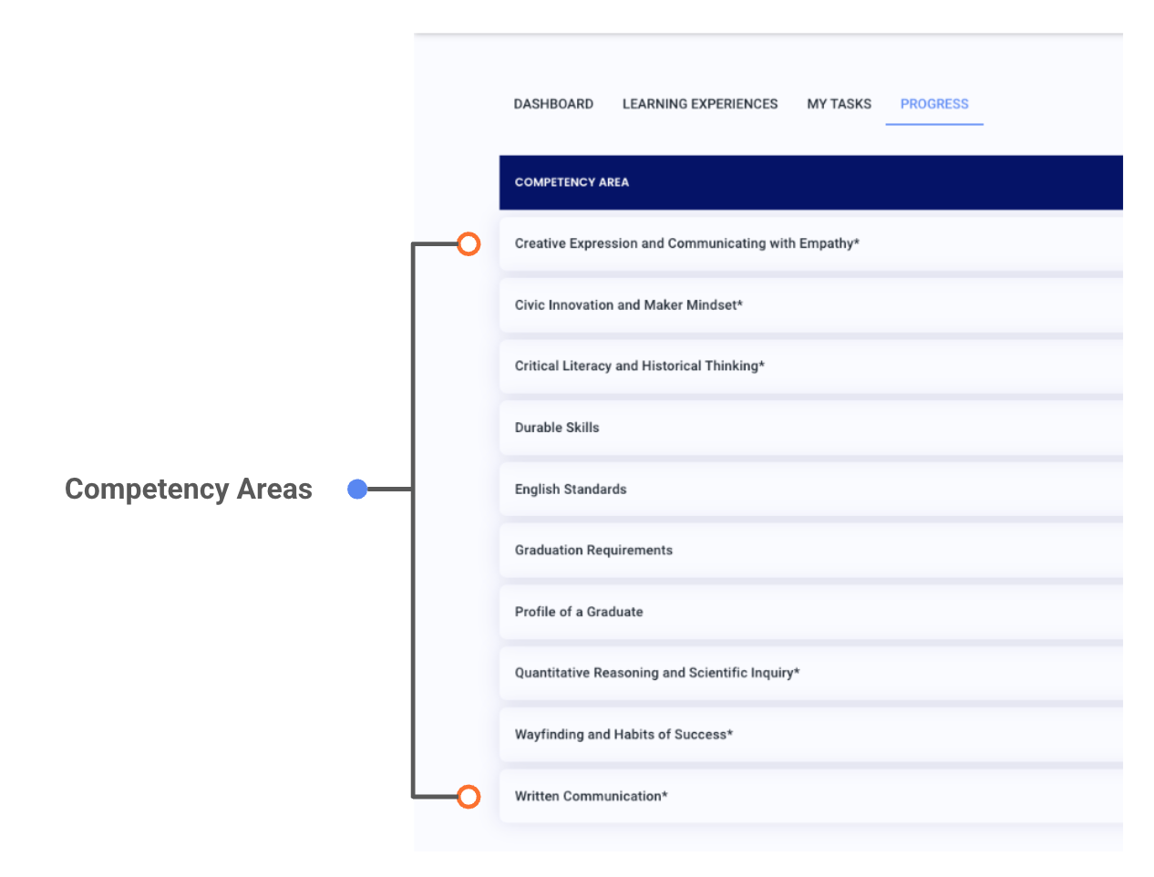 A competency area is a broad topic or subject, like Creative Expression and Communicating with Empathy. The competency areas a learner is working on appear on the Progress page. In Beacon, standards are also referred to as competencies, so both are included as competency areas.