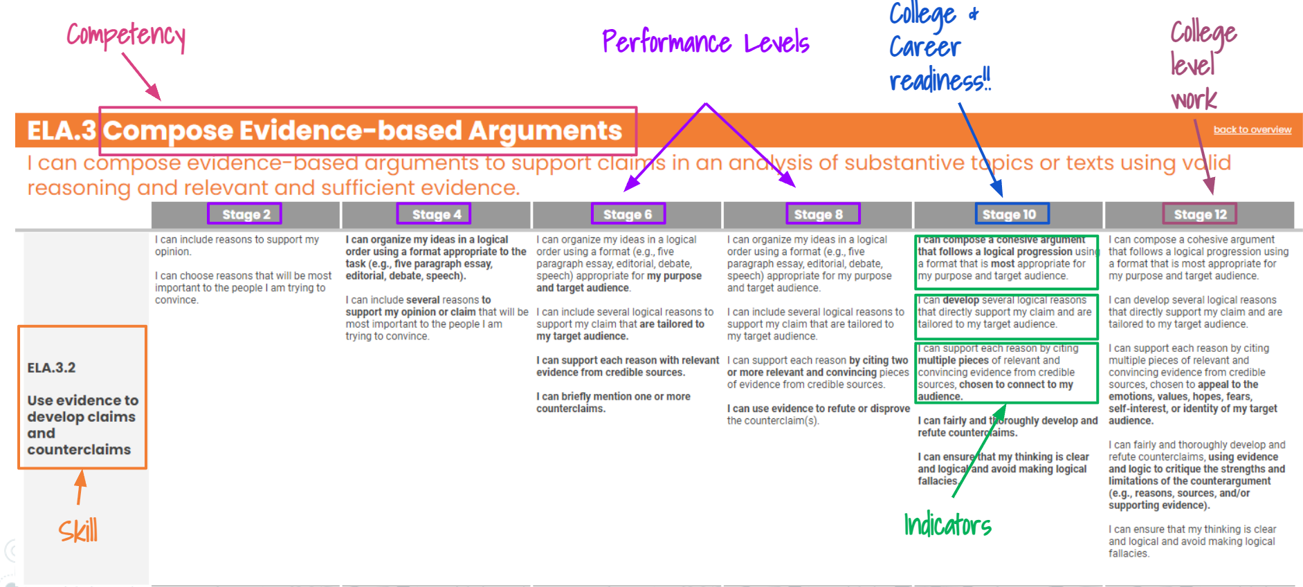 Here is an example of the continua for the skill Use evidence to develop claims and counterclaims, which is under the competency Compose Evidence-based Arguments under the area ELA.